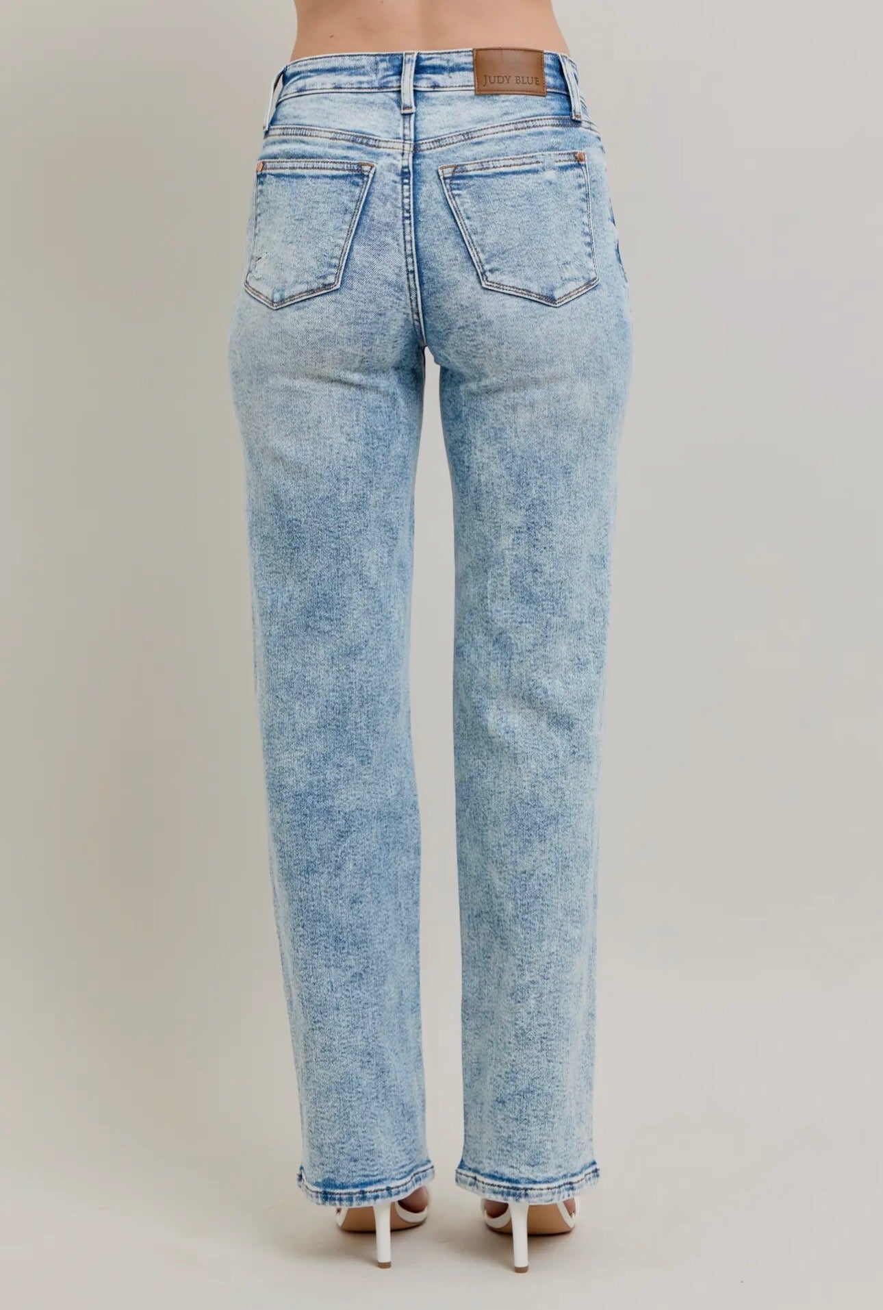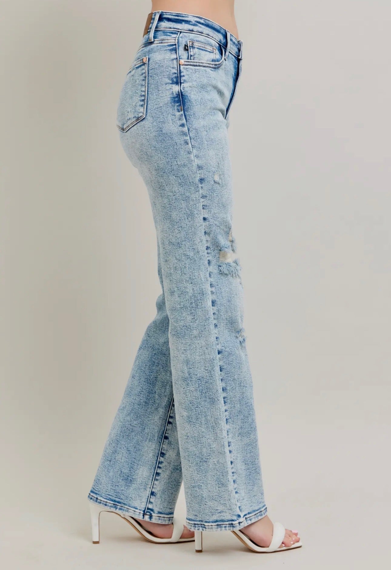Our 90's Acid Wash High Waisted Judy Blue Jeans are a must-have for any contemporary wardrobe. These jeans feature a high waist that complements the floor-length, straight cut. The light wash gives these jeans a 90's vibe, while the distressed detailing adds a modern edge.