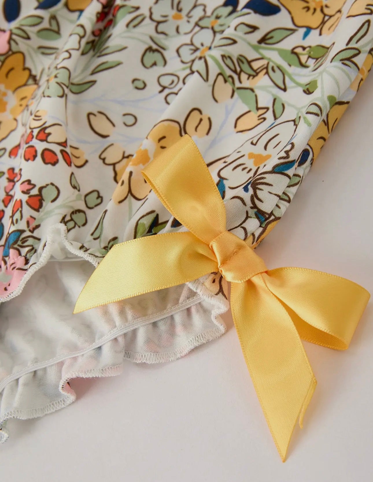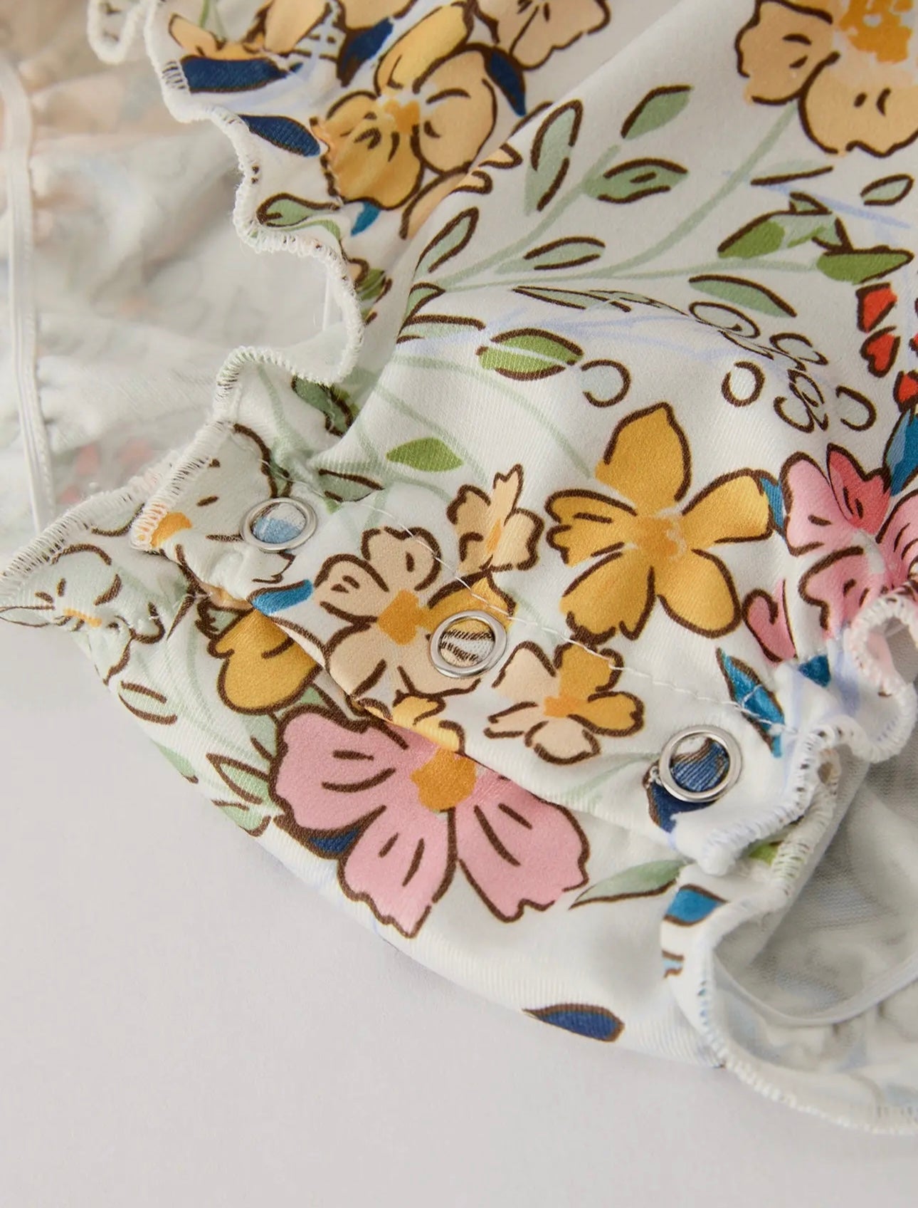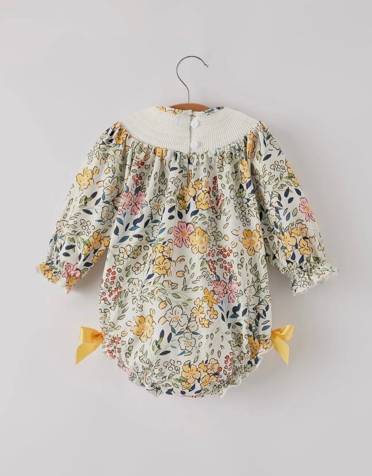 Beautiful floral romper with delicate embroidery details with the cutest buttons and yellow bows.