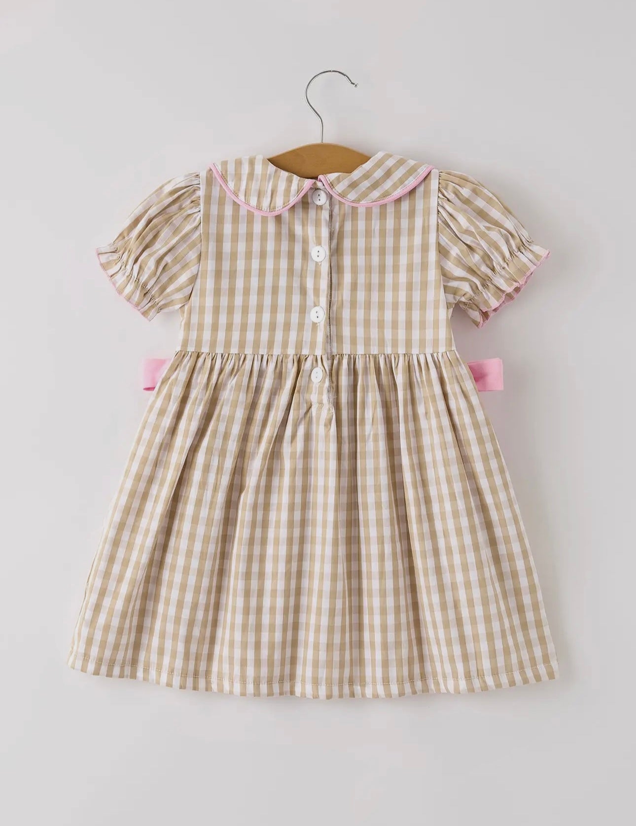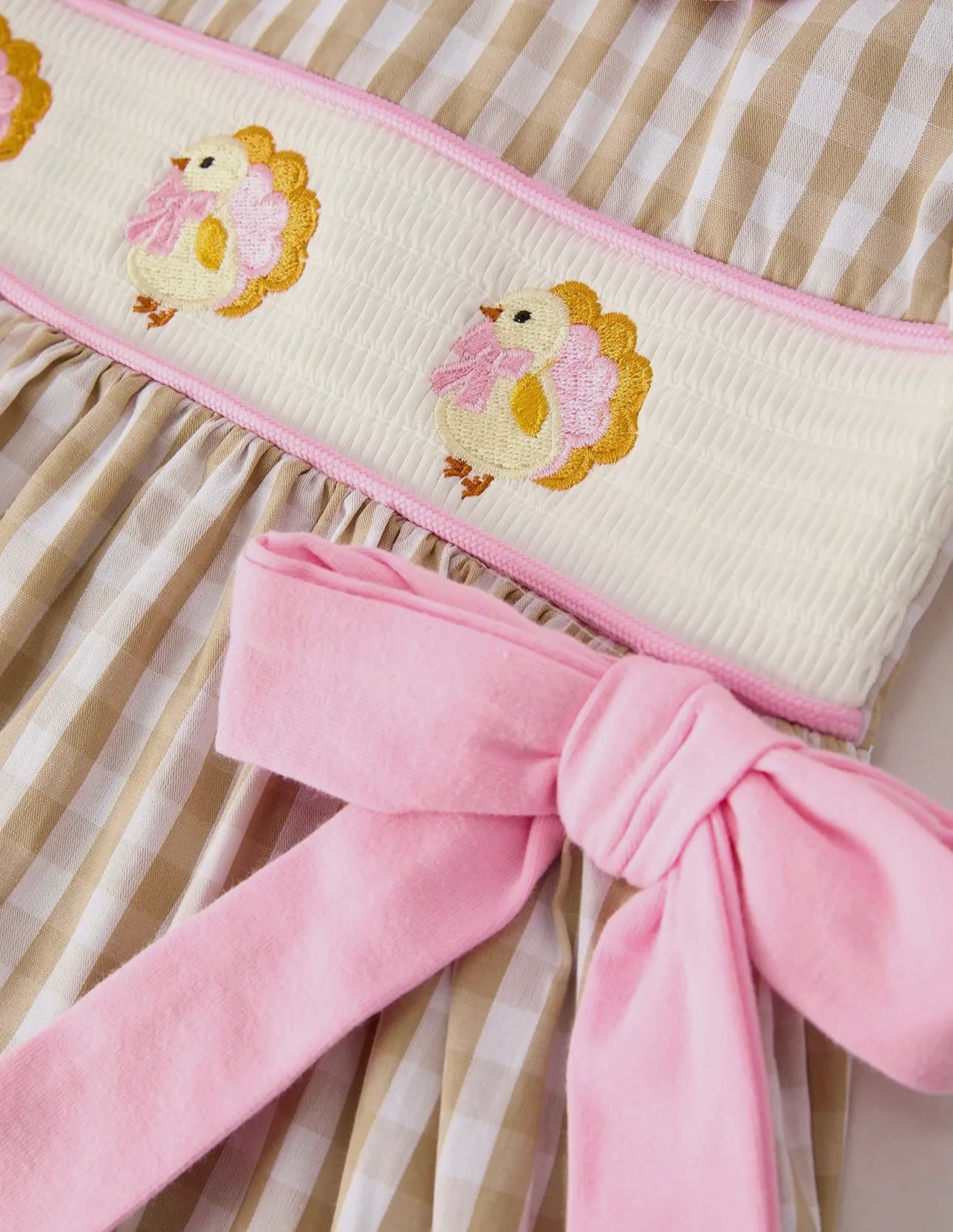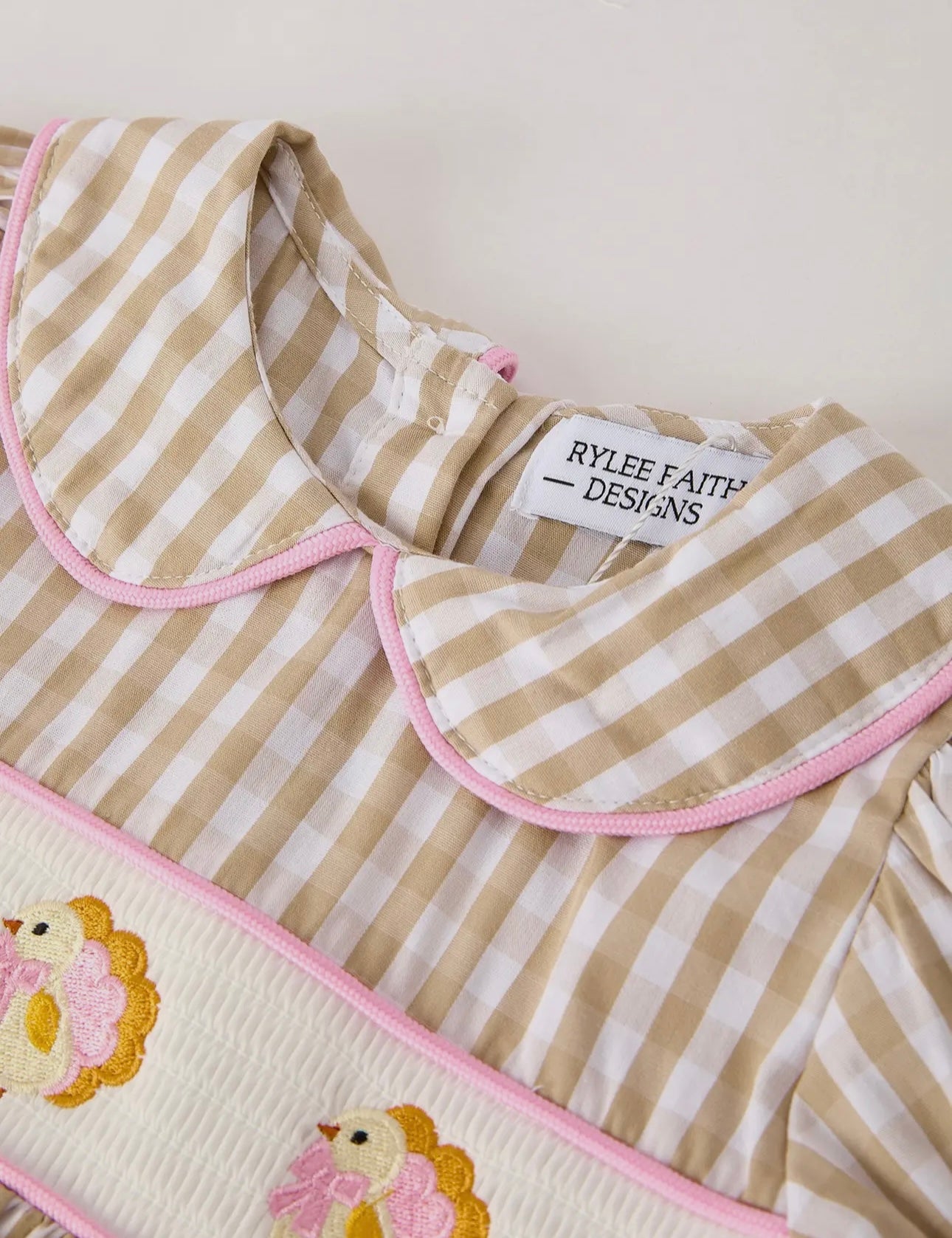 The most charming little girls dress with the cutest neutral plaid pattern and adorable Turkey embroidery. This dress has the perfect details with a smocked bodice and delicate pink bows. Your little girls will be irresistibly cute at Thanksgiving or any fall festivities!