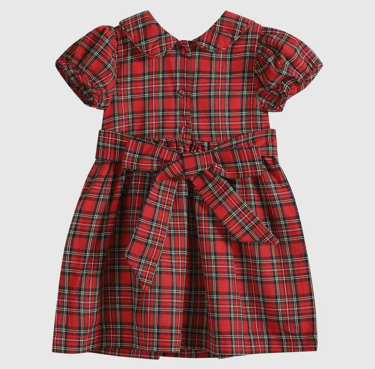 Charming for Christmas! This beautiful red plaid dress features pretty Santa embroidery, a peter pan collar, a tie-up bow, and smocking. Made in 100% soft cotton ensure your little sweetie is comfortable all day long. A fun and vibrant outfit for your cutie and all of her Christmas fun. From getting photos with Santa to decorating the tree; no matter the occasion she will be looking picture-perfect!