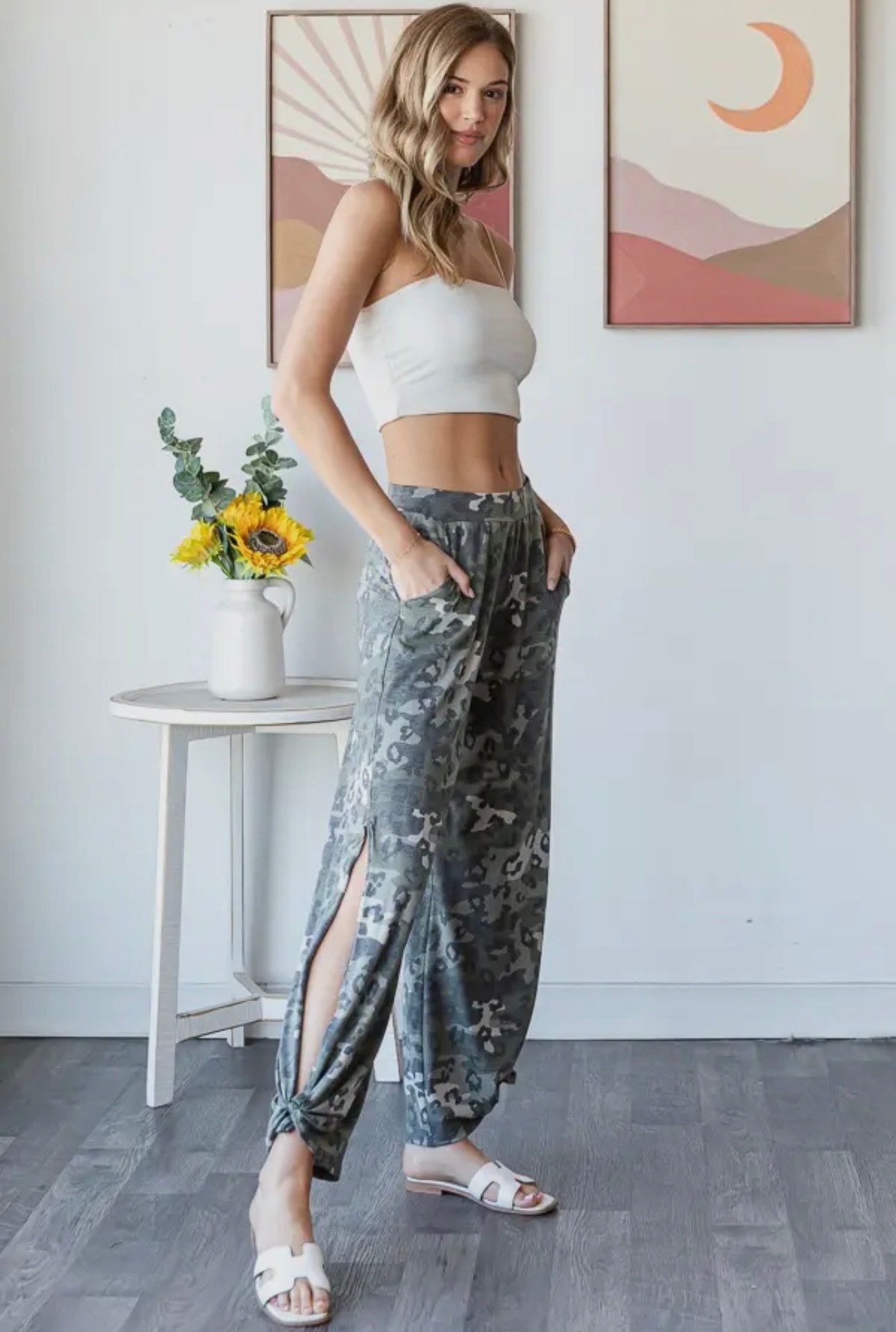 CAMO & LEOPARD CAMO PRINT WIDE LEG PANTS WITH A UNIQUE SIDE SLIT WITH ANKLE TIES TO ADD A LITTLE STYLE TO YOUR COMFORTABLE STYLE. THEY HAVE ELASTIC WAISTBANDS, SIDE POCKETS AND RELAXED FIT.