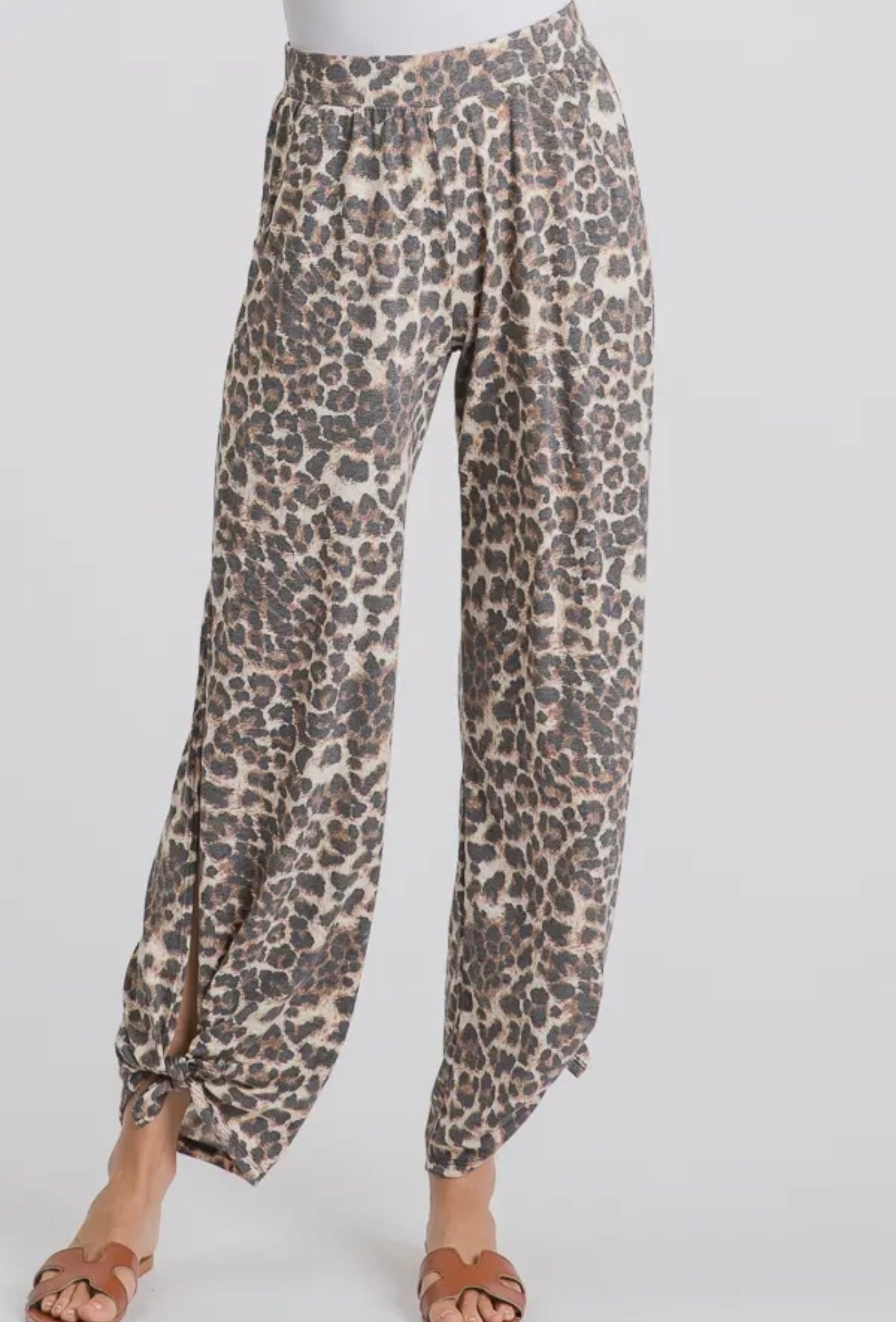LEOPARD CAMO PRINT WIDE LEG PANTS WITH A UNIQUE SIDE SLIT WITH ANKLE TIES TO ADD A LITTLE STYLE TO YOUR COMFORTABLE STYLE. THEY HAVE ELASTIC WAISTBANDS, SIDE POCKETS AND RELAXED FIT.